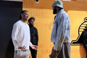 賽后,詹姆斯與華盛頓指揮官四分衛杰登·丹尼爾斯見面,兩人體型差距還是很大的。