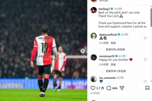 斯特林此役替補出場,上演費耶諾德首秀,賽后他在社交媒體上寫道:“重返賽場,對上帝唯有感恩。”
