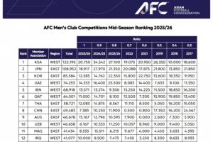 2025/2026賽季亞足聯男子俱樂部賽事中期排名榜(前10):