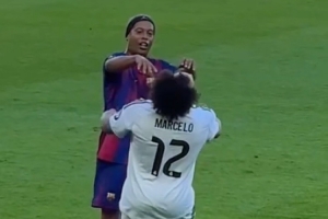 巴薩傳奇隊vs皇馬傳奇隊的表演賽在美國洛杉磯進行,比賽中小羅開玩笑推搡馬塞洛,后者順勢倒地,復制了昔日國家德比的“火藥味”。