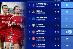 體育資訊2月23日訊 在本輪英超,利物浦1-0擊敗諾丁漢森林,麥卡利斯特補時讀秒絕殺。德轉(zhuǎn)也盤點了本賽季五大聯(lián)賽在補時階段進球+失球最多的球隊榜單,具體如下: