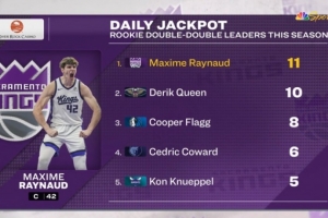 國王42號秀雷諾再次拿到兩雙,超過鵜鶘新秀奎因,兩雙次數躍升為本屆新秀第一。