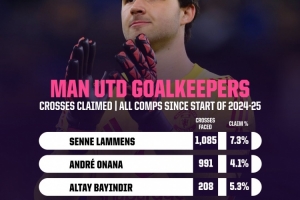 2024-25賽季以來,拉門斯共1085次面對傳中球,他摘傳中球成功率為7.3%;奧納納991次面對傳中球,摘傳中球成功率為4.1%;而巴延德爾則是208次面對傳中球,摘傳中球成功率為5.3%。