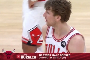 上半場(chǎng)比賽,公牛前鋒布澤利斯扛起球隊(duì)進(jìn)攻大旗,進(jìn)攻端里突外投效率不錯(cuò),他出戰(zhàn)18分鐘,12中7,三分6中2拿到16分4籃板1搶斷。