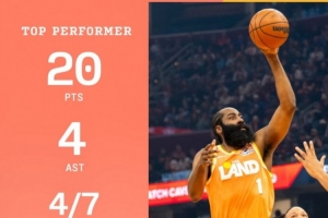 全場比賽,哈登出戰32分12秒,18投8中,三分7中4,沒有罰球,得到20分2籃板4助攻,正負值+9。