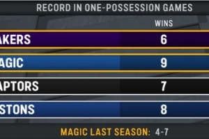 湖人主場迎戰魔術,轉播方給出一項統計,本賽季一回合定勝負(分差3分以內)的比賽,湖人6勝0負排名第一,魔術9勝3負排名第二。