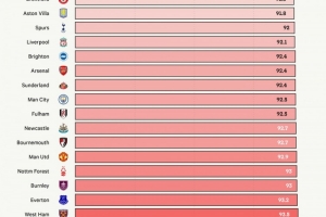 Opta超級(jí)計(jì)算機(jī)列英超剩余賽程難易度榜單(數(shù)值越高越難):