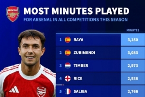 體育資訊2月25日訊 德國轉會市場統計了本賽季阿森納球員在所有賽事中的出場時間,并列出榜單。