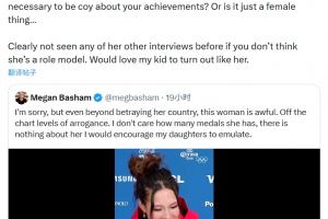 Megan Basham轉發了這段視頻,并在社媒寫道:抱歉,即便拋開背叛這一點不談,這個女人也糟糕透了。她的傲慢程度簡直爆表。不管她拿過多少獎牌,我都找不到任何一點值得我女兒學習的地方。