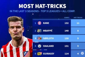 德轉(zhuǎn)列出五大聯(lián)賽球員最近三個賽季在各項賽事戴帽次數(shù)榜,瑟爾洛特與哈蘭德5次并列第三,凱恩11次居首。