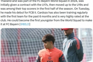 報道稱這位在泰國長大的巴西小將曾在2024年入選拜仁世界隊。最初他與U17梯隊簽約,隨后升入U19梯隊,并在賽季前半段成為該隊的主要得分手之一。本周二他首次代表拜仁二隊出場。在過去六個月里,卡爾多佐還經(jīng)常與一線隊一起訓(xùn)練,并在俱樂部中備受好評。他有望成為首位從世界隊脫穎而出并成功進入拜仁一線隊的年輕球員。