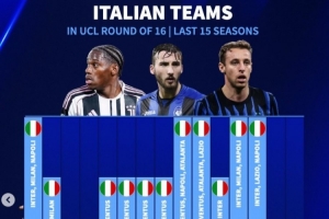 體育資訊2月26日訊 本輪歐冠附加賽,尤文加時憾負、國米被雙殺出局,亞特蘭大大逆轉晉級。《轉會市場》也統計了近年歐冠16強的意甲球隊數量: