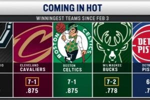 據(jù)統(tǒng)計,2月3日至今聯(lián)盟戰(zhàn)績最好的5支球隊為: