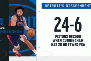 上一場(chǎng)比賽坎寧安26投5中僅得16分,活塞主場(chǎng)103-114不敵馬刺