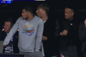 補時第4分鐘,鏡頭給到看臺上的皇馬多名球員。米利唐和貝林專注看比賽,赫伊森吃著什么東西。