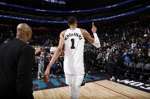 本場比賽,文班亞馬出戰30分鐘,12中3,三分6中1,罰球6中5拿到12分8籃板3助攻1搶斷5蓋帽,正負值+19。