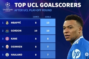 體育資訊2月26日訊 歐冠淘汰賽附加賽已經完賽,《轉會市場》也統計了本賽季歐冠射手榜,姆巴佩居首。