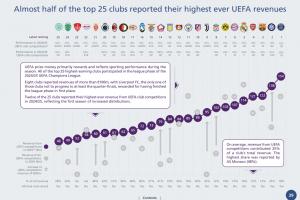 歐足聯獎金主要獎勵并反映賽季內的競技表現。前25名最高收入俱樂部均參加了2024/25賽季歐冠聯賽階段比賽。其中8家俱樂部歐戰收入超過1億歐元。利物浦是唯一未進入八強的球隊,但因聯賽階段位列頭名而獲得豐厚回報。25家球隊中12家俱樂部在本賽季歐足聯俱樂部賽事收入創歷史新高,得益于新賽制下分發金額的提升。