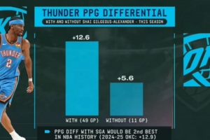 備注:本賽季有SGA時雷霆場均凈勝分可排歷史第二(第一為2024-25賽季雷霆:+12.9)
