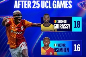 數據統計顯示,奧斯梅恩(尼日利亞)在25場歐冠后打進16球,也超越了藍軍傳奇德羅巴(科特迪瓦)的同期數據(15球),在非洲球員中僅次于18球的吉拉西(幾內亞)。