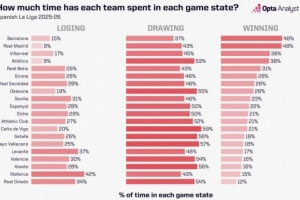 體育資訊2月27日訊 本賽季西甲25輪戰罷巴薩以1分優勢領先皇馬居首,OPTA盤點了西甲各支球隊本賽季在場上處于落后、平局以及領先形勢的時間占比。