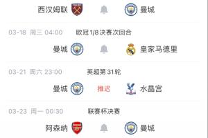 體育資訊02月27日訊 曼城3月8日開始死亡賽程,15天內連戰紐卡(足總杯)、皇馬(歐冠兩回合)以及阿森納(聯賽杯決賽)!