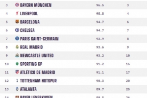 體育資訊2月27日訊 本賽季歐冠淘汰賽抽簽結束,以下為數據網站OPTA對歐冠16強做的實力排名(括號內為全球排名)。