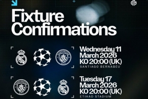 體育資訊2月27日訊 歐冠1/8決賽,皇馬對陣曼城,兩回合比賽開球時間已經確定。