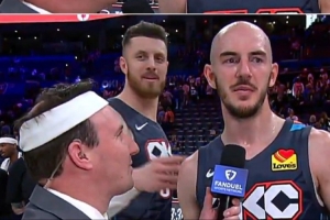 賽后雷霆球員卡魯索在場邊接受隊記Nick Gallo的采訪。哈爾滕施泰因過來整蠱隊記,將卡魯索的頭戴摘下并套在Nick Gallo頭上,發帶秒變“繃帶”。