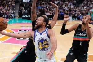 文班到三分線去追庫里,被庫里直穿籃下造罰球;瓦塞爾繞掩護(hù)細(xì)節(jié)不好,被庫里要到三罰球:半節(jié)庫里三個(gè)三分9個(gè)罰球,內(nèi)外開花,馬刺防守崩壞: