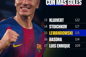 如今,萊萬已經為巴薩打進115球,超越巴索拉位居隊史射手榜第15位,僅落后第14位的斯托伊奇科夫兩球。