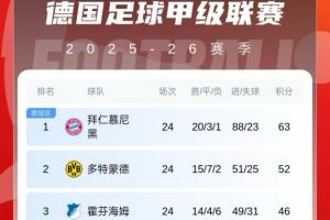 體育資訊03月01日訊 德甲第24輪德國國家德比,拜仁3-2逆轉多特,現11分領跑積分榜。最新德甲積分榜如下: