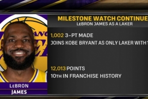 本場比賽,湖人球星詹姆斯命中4記三分球,他在湖人隊(duì)已經(jīng)命中1002記三分球,成為隊(duì)史繼科比之后第二位命中1000+三分球的球員。