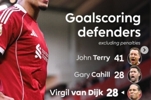 本場比賽范戴克打進一球,英超官方統計,范戴克在英超非點球破門次數追平卡希爾,并列英超后衛次席。以下為英超歷史后衛非點球破門次數榜: