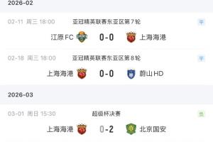 2026年海港進行了3場正式比賽,亞冠兩場均為0-0平,本場0-2負,三場比賽都沒有進球入賬。