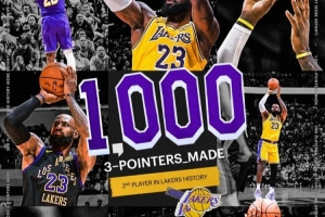 詹姆斯在湖人隊已經命中1002記三分球,成為隊史繼科比之后第二位命中1000+三分球的球員。