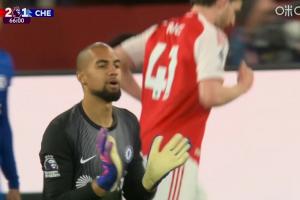 丟球后桑切斯馬上抗議,馬上給的鏡頭,場邊羅塞尼爾也在示意VAR。