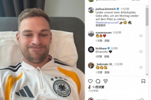 基米希社媒曬出自己在醫療室的照片,并寫道:“遺憾的是這里暫時成為了我的工作場所,我會竭盡全力,爭取在下周一(對陣斯洛伐克)重返賽場。”