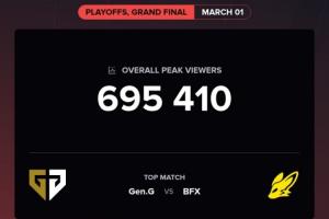 體育資訊03月02日訊 數(shù)據(jù)網(wǎng)站公布了昨日2026LCK Cup總決賽GEN vs BFX的直播熱度情況,本場Bo5觀眾峰值只有69.5w,連去年同期決賽熱度的一半都不到。