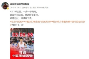 體育資訊3月2日訊 北京時間3月1日,豐配友在東京馬拉松比賽中以2小時05分58秒完賽,取得亞洲第一名,并且打破全國馬拉松記錄,帶領中國進入205時代。賽后,豐配友在社媒分享自己的成績并表示感謝,同時自勉將繼續努力。