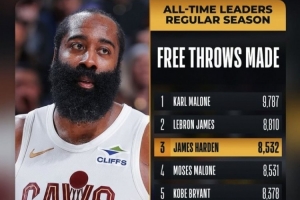 本場比賽過后,哈登生涯總罰球命中數來到8535個,超越摩西·馬龍(8531個)升至歷史第3,排在第2的是詹姆斯(8810個)。
