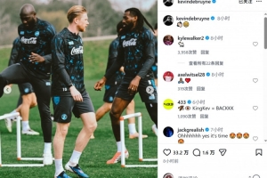德布勞內肌肉受傷接受手術,自去年10月25日以來一直缺席?,F在德布勞內已經恢復訓練,他在社交媒體上曬出訓練照片,并配上笑臉的表情符號。