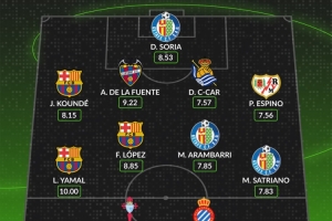 體育資訊3月3日訊 西甲第26輪比賽戰罷,WhoScored列出了本輪最佳陣容,亞馬爾領銜。