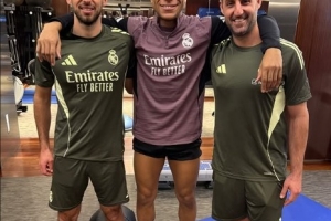 姆巴佩曬出了與皇馬體能教練Sébastien Devillaz和理療師Willy Zurdo的合照,配文寫道:“一切全看努力。????”
