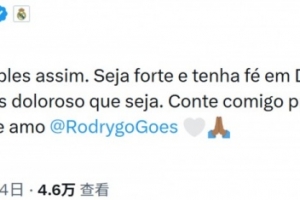 體育資訊3月4日訊 皇馬官方確認,隊內前鋒羅德里戈右膝十字韌帶斷裂,外側半月板斷裂,隊友米利唐社媒留言鼓勵羅德里戈。