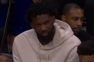 本場因右側腹斜肌拉傷而缺席比賽的76人核心恩比德,在球隊落后時坐在替補席面帶笑意。