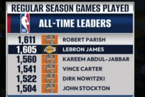 詹姆斯已經出戰1605場常規賽歷史第二,距離第一的帕里什只差6場。