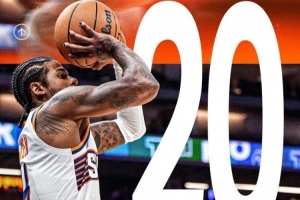 賽后太陽(yáng)官推發(fā)布杰倫·格林20分?jǐn)?shù)據(jù)海報(bào),并寫道:“杰倫·格林今日得分領(lǐng)跑全隊(duì)!”