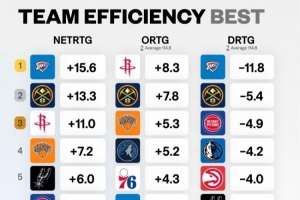 體育資訊11月14日訊 美媒Basketball University發布了賽季至今的各隊凈效率、進攻效率以及防守效率前十的幫當。其中雷霆凈效率+15.6排名第一,進攻效率火箭+8.3排名第一,防守效率雷霆-11.8排名第一。