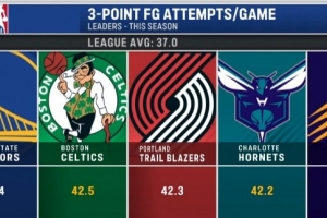 本賽季三分出手球隊TOP5:勇士、綠軍、開拓者、黃蜂、太陽